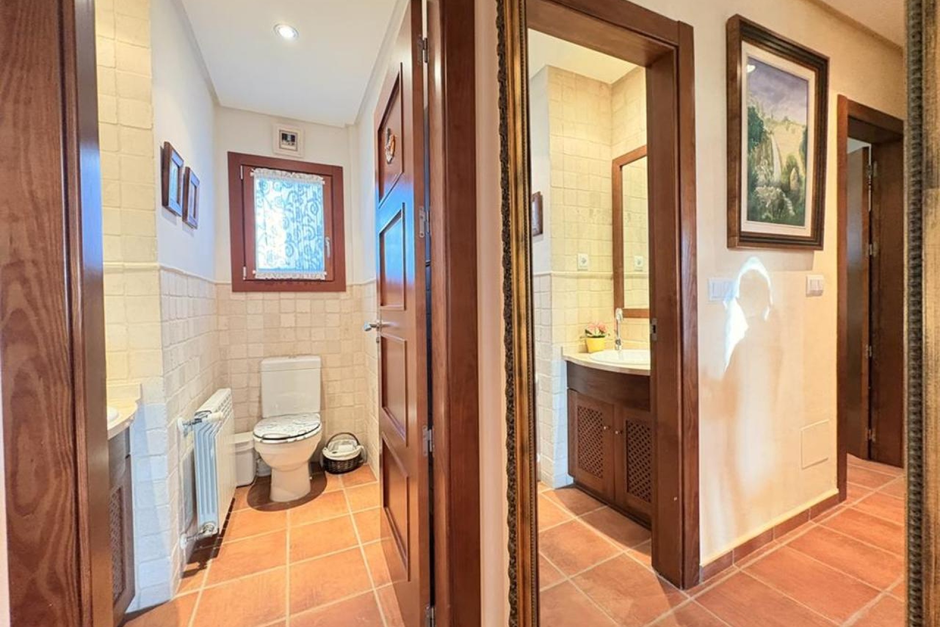La villa dispose de hauts plafonds avec poutres apparentes en bois, créant une atmosphère chaleureuse et pleine de caractère, typique du style espagnol traditionnel. L’agencement intérieur est spacieux et équilibré, avec une grande cuisine entièrement équipée et une buanderie attenante, idéale pour la vie quotidienne.