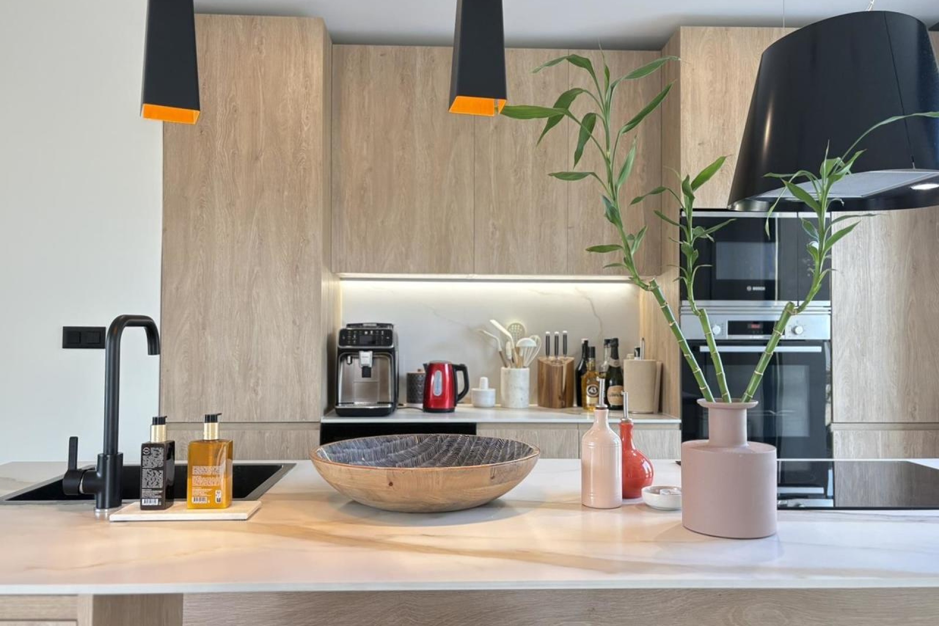 Dankzij de gewilde ligging op het zuiden baadt de villa de hele dag in natuurlijk licht. Het hart van de woning wordt gevormd door een ruime open keuken en woonkamer, die via grote glazen schuifdeuren naadloos aansluiten op de buitenruimte. De moderne keuken is volledig uitgerust, met een wijnkoeler, twee koelkasten en een inloopkast/wasruimte.