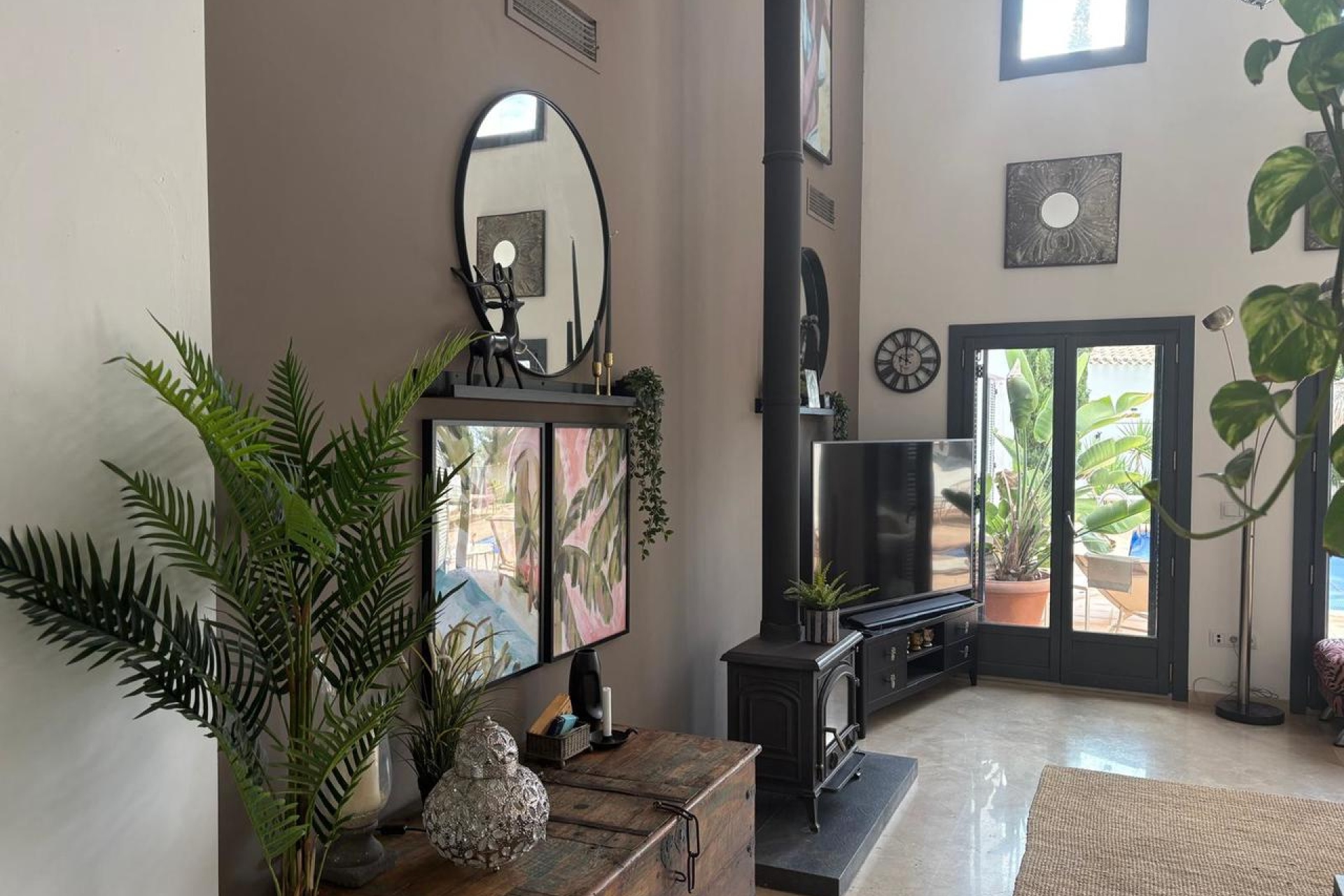 • French doors from the living room open directly to the outdoor terrace and garden.