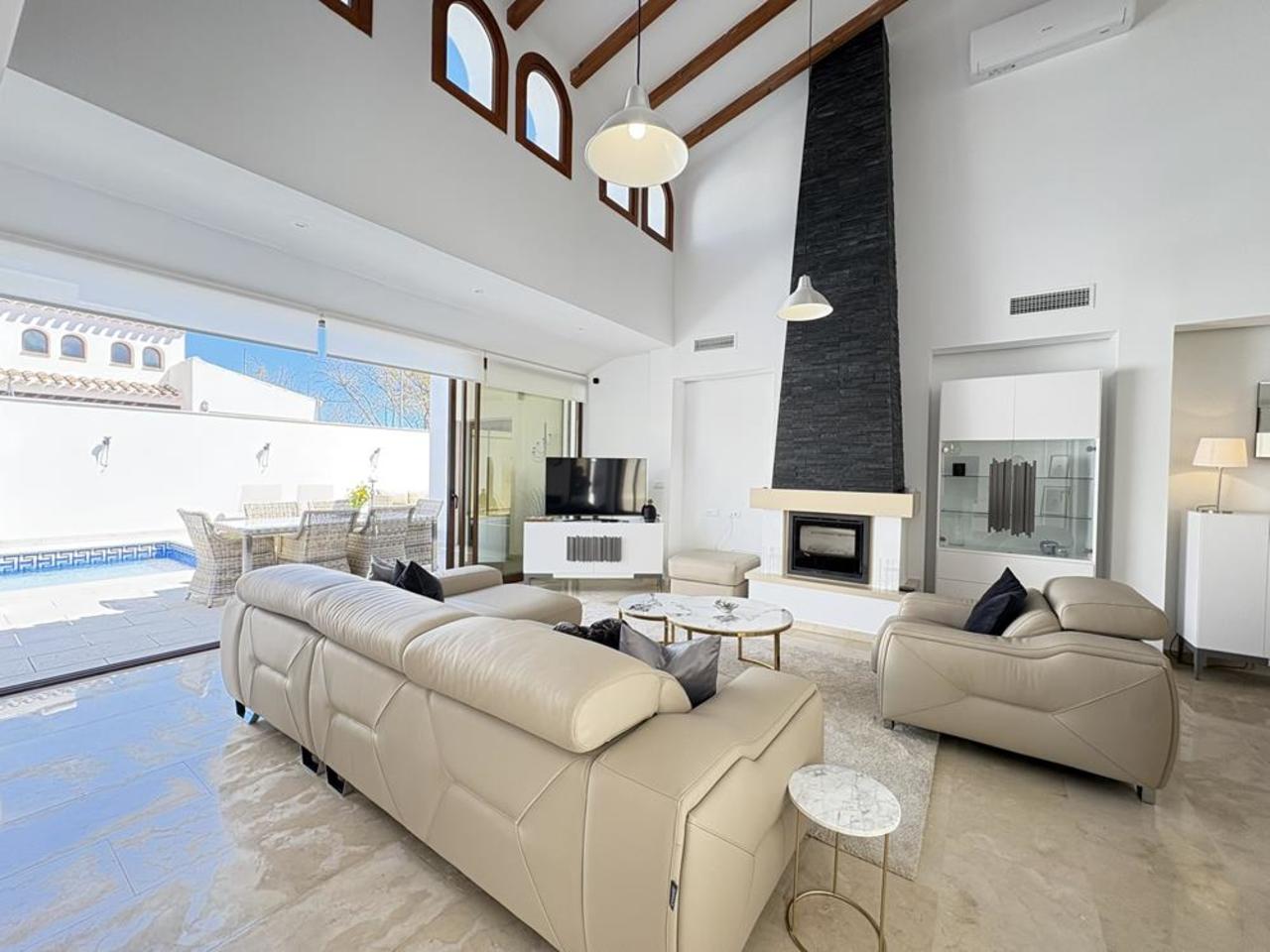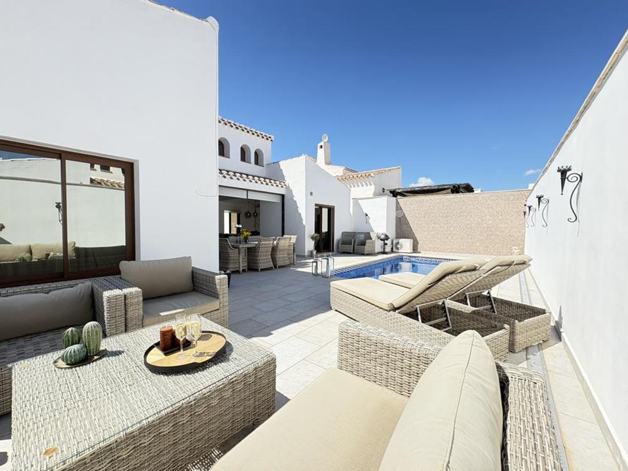 This spectacular property has three spacious and bright bedrooms and two bathrooms. The master bedroom has an en-suite bathroom and direct access to the outdoor pool area, creating an unrivalled space for relaxation and comfort.