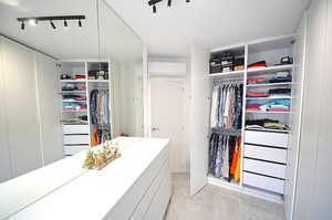 Bedroom 2 is currently presented as a full walk-in dressing room with a range of floor to ceiling wardrobes providing extensive hanging space, drawers and panoramic mirror. This is a fashion lover’s dream