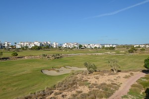 Spacious private L-shaped terrace with uninterrupted views of the golf course, shimmering lake and the La Manga coastline in the distance