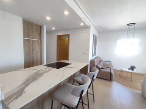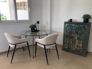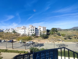 This upgraded second floor corner apartment has a large sunny terrace with sweeping views over the gardens, pool, golf and lake. This renovated apartment and has a modern open plan kitchen with breakfast bar and living area. The large terrace has extras windows to the side allowing the light to flood into the home. The bathroom also benfits from an extra window and has a new modern walk in shower. The stylish bedrooms both have fitted wardrobes and a Juliette terrace.It is situation very close to the club house restaurant, supermarket and coffee shop. The apartment is being sold fully furnished minus personal possessions. It would make an excellent holiday home or suitable for permanent living.The first thing that impresses you about Hacienda Riquelme Golf Resort is the wide-open spaces, the extensive gardens and the low-density construction, which create a relaxing environment to enjoy a very safe and peaceful life or holiday. The apartments are set out spaciously around the magnificent and challenging 18 hole golf course part of the Jack Nicklaus Golf Trail.All apartments have unlimited internet, air-conditioning for summer and heating for winter, private underground parking space and a communal lift.In the heart of the resort you will find the beautiful renovated Hacienda where you will find a supermarket, clubhouse, restaurant and bar. The inner court yard becomes the hive of entertainment in the Summer, whilst the large terrace set in the stunning gardens is open all year for “al fesco” dining and drinking.Facilities:Gated Community.24 hour security.”El Cason” Bar, Restaurant, Clubhouse. “Sips” Coffee ShopSupermarket.Summer Entertainment.19 large community swimming pools.Communal gardens.Trees, 5 lakes.Wild flowers & local wildlife.Driving range & Golf ShopTennis courts.Paddle tennis courts.Football / Basketball court.Outside gym area.Children’s play areas.Hacienda Riquelme is very well connected by the main motorways. Murcia Airport (20 mins)Mar Menor beaches (15 mins)Mediterranean beaches (20 mins)For those who like historical buildings, architecture or a desire to shop, the lovely cities of Murcia and Cartagena provide plenty of entertainment. Murcia (30 mins)Cartagena (45 mins) Murcia Airport (20 mins)Near to the bustling popular village of Sucina with shops, restaurants, bars, chemist, supermarket and lots more (5 minutes)For more information on the apartments available please contact us.