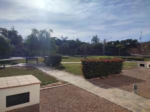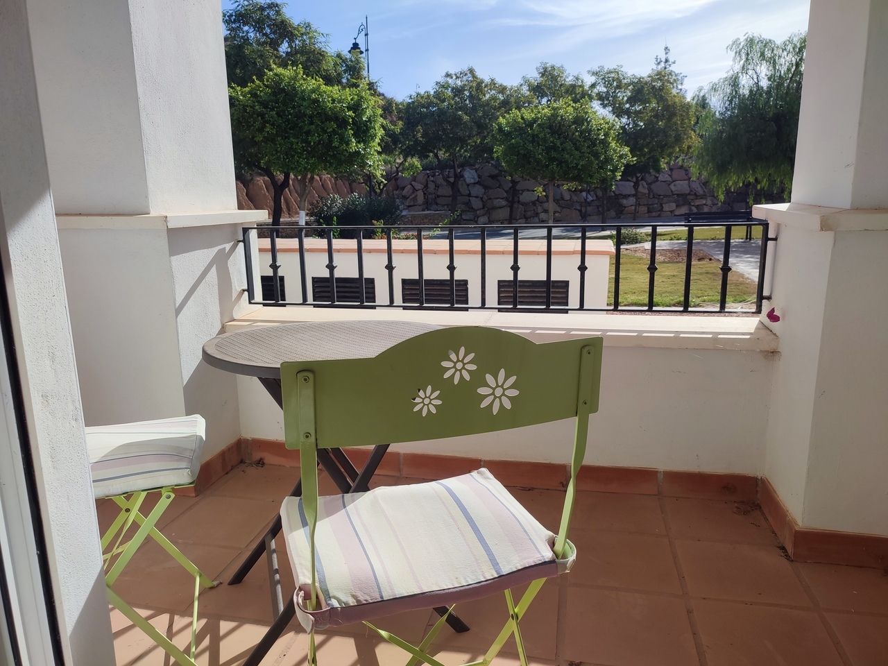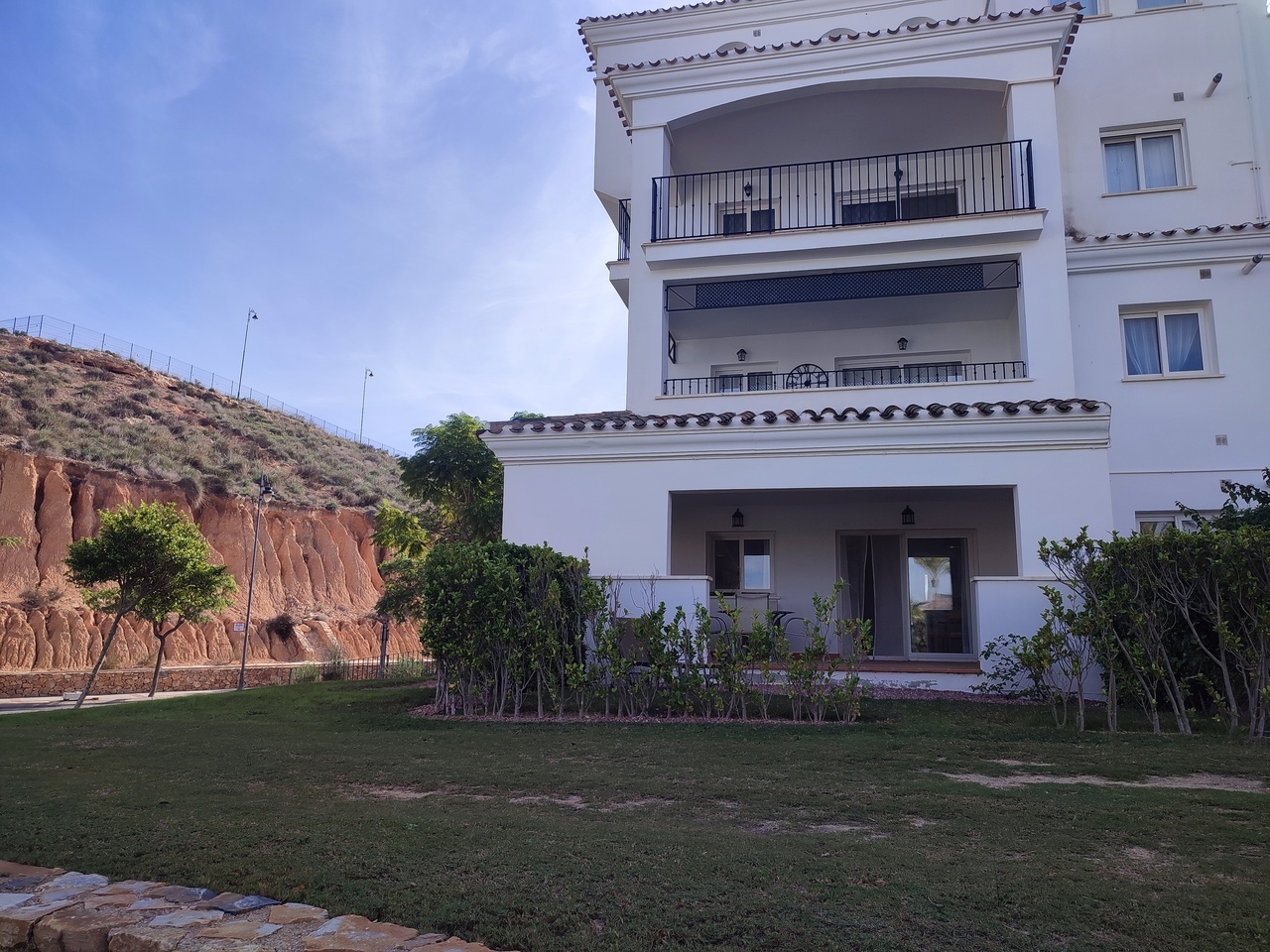 This ground floor corner garden apartment has the largest overall plot size available on Hacienda Riquelme and has lovely views over the gardens, swimming pool and to the mountains. The popular curved wall design apartment has a great sized kitchen and being on a corner also benefits from extra windows in the lounge and bathroom. Furthermore, if required, the design of this style of apartment can easily be made open planned and the opportunity to add a second bathroom if required. The property has air-conditioning throughout for summer and central heating for winter. A private underground parking space is also included in the sale.The apartment is being sold furnished minus personal possessions. It would make an excellent holiday home or suitable for permanent living.The first thing that impresses you about Hacienda Riquelme Golf Resort is the wide-open spaces, the extensive gardens and the low-density construction, which create a relaxing environment to enjoy a very safe and peaceful life or holiday. The apartments are set out spaciously around the magnificent and challenging 18 hole golf course part of the Jack Nicklaus Golf Trail. In the heart of the resort you will find the beautiful renovated Hacienda where you will find a supermarket, clubhouse, restaurant and bar. The inner court yard becomes the hive of entertainment in the Summer, whilst the large terrace set in the stunning gardens is open all year for “al fesco” dining and drinking.Facilities:Gated Community.24 hour security.”El Cason” Bar, Restaurant, Clubhouse. “Sips” Coffee ShopSupermarket.Summer Entertainment.19 large community swimming pools.Communal gardens.Trees, 5 lakes.Wild flowers & local wildlife.Driving range & Golf ShopTennis courts.Paddle tennis courts.Football / Basketball court.Outside gym area.Children’s play areas.Hacienda Riquelme is very well connected by the main motorways. Murcia Airport (20 mins)Mar Menor beaches (15 mins)Mediterranean beaches (20 mins)For those who like historical buildings, architecture or a desire to shop, the lovely cities of Murcia and Cartagena provide plenty of entertainment. Murcia (30 mins)Cartagena (45 mins) Murcia Airport (20 mins)Near to the bustling popular village of Sucina with shops, restaurants, bars, chemist, supermarket and lots more (5 minutes)For more information on the apartments available please contact us.