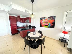 Upon entering, you will find the heart of the home, which is the open-plan kitchen and living room, filled with natural light thanks to the south-facing orientation and the large sliding glass doors. From here, you access a spacious, beautifully maintained terrace-garden with open views over the communal pool. Designed for low maintenance, this outdoor space is perfect for relaxing and entertaining.