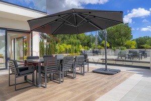 Outdoors, enjoy the perfect balance of relaxation and entertainment. A temperature controlled infinity pool and jacuzzi with a saltwater system, lush landscaped gardens,- and ample terraces ideal for dining and sunbathing.Sustainability meets luxury with solar panels powering the villa, ensuring energy efficiency throughout the year. The temperature-controlled double garage offers secure parking for two cars.The property comes fully furnished, with premium finishes and modern décor that complement its sleek architectural design