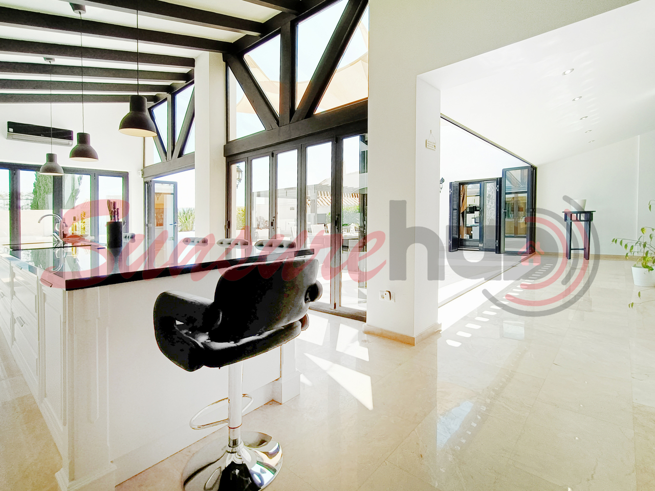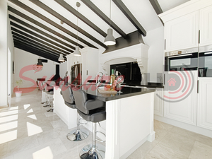 A fully renovated kitchen, complete with modern fittings and bi-folding doors that open seamlessly to the pool area, blending indoor and outdoor living