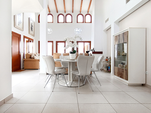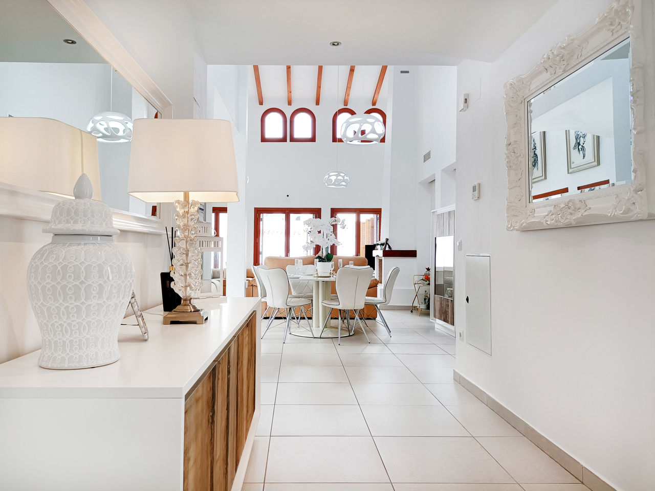 Open-plan living and dining areas with patio doors opening onto a south-facing terrace and private pool â perfect for entertaining or relaxing in the sun