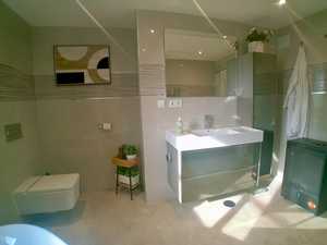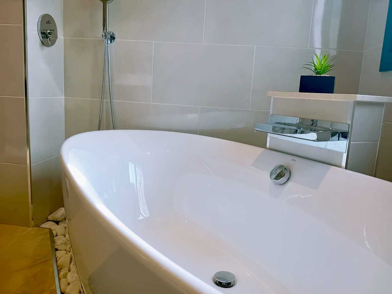 Modernised master bathroom with large bathtub