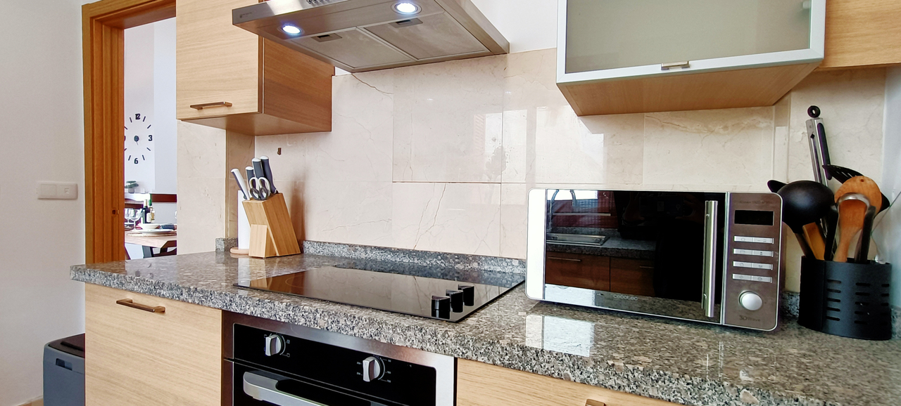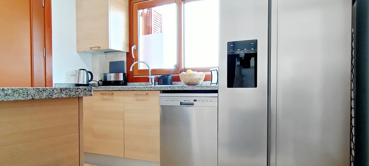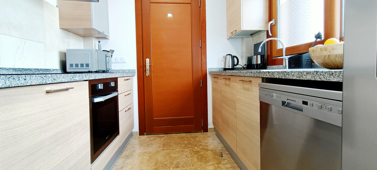 Fully equipped kitchen with quality appliances, ample worktop space, and open utility area